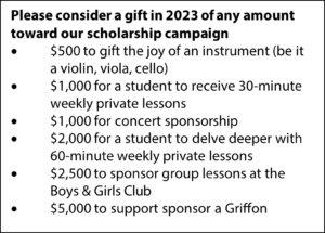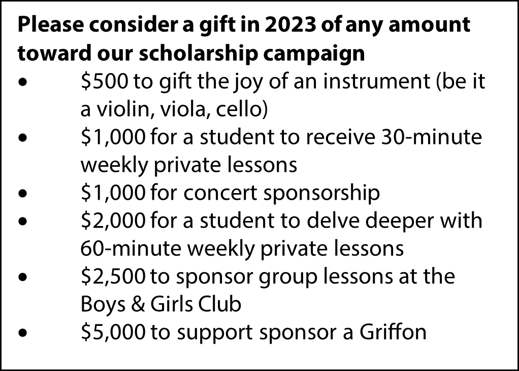 To continue our mission – to ensure that every child can pick up an instrument regardless of their financial situation and keep music a vibrant and integral part of our community – we need your help. Donations from patrons like you help support scholarships, purchase instruments for budding musicians, and fund so many wonderful outreach programs that make our work and our lives so fulfilling.